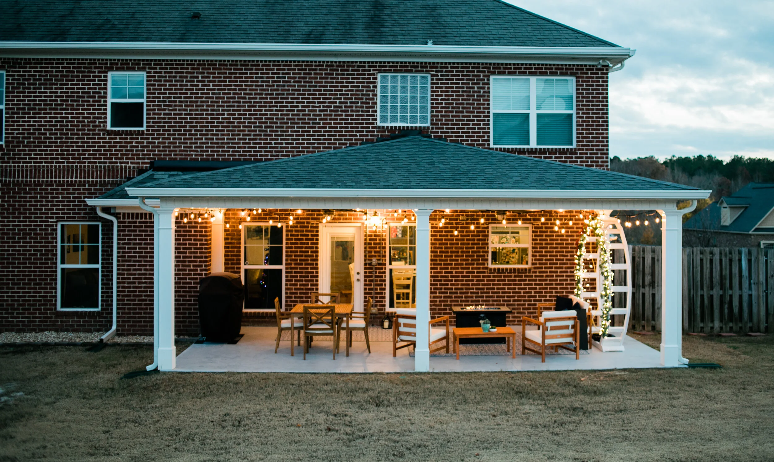 Sharing our outdoor patio on the blog today! Itβs easily become one of our favorite places for dinner with the kids running around in the backyard after. When we first moved in, there was just a small square back there with no covering and got a lot of sun during the day and it also need gutters which we added. We knew we would remove that shed falling apart too and replace it with a swingset. Nathaniel had the great idea to make it a good bit bigger and we had fresh concrete poured to extend the space. I happened to see a wedding planner selling this arch on Instagram one day and immediately knew I wanted to include it on the patio with string lights and change up the decor on it through the seasons. We took these photos around Christmas last year so you can imagine how cozy our little fire and lights are back there as the weather cools down in the evening! Thanks so much to Will with Impact Roofing and Construction who built this for us! As always keep scrolling for before and afters below and a couple behind the scenes as it was being built! For all our other home reno projects in the past year, click here!